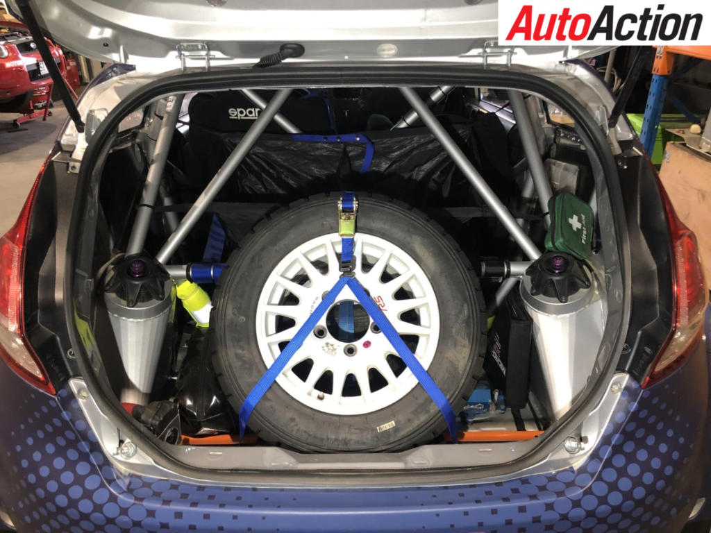 Anear and Glenney communicate via a Stilo Bluetooth Communication system, while in the back the Fiesta can carry two spare tyres, but under the R5 regulations must carry at least one. Fitting in alongside the spare is a hydraulic jack and an electric rattle gun.