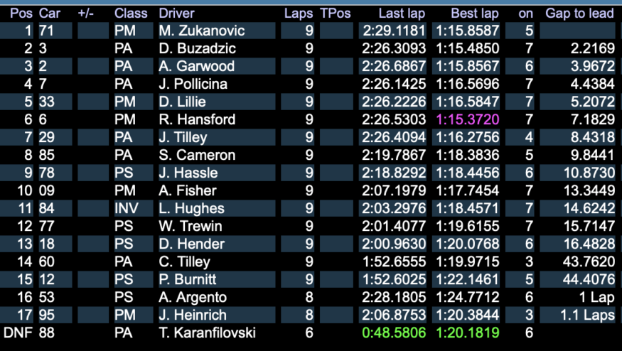 The race was shortened to just nine laps after Tony Karanfilovski went off at Dandenong Road, while Joel Heinrich also had a tough one, suddenly dropped from the top six to a lap down.